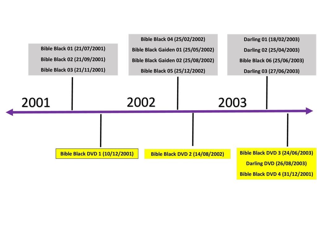 Les explicaré la imagen para que la entiendan. En la parte del medio está la línea de tiempo que abarca desde el 2001 hasta el 2003. En la parte de arriba salen los capítulos de Bible Black y Darling junto a la fecha en la que se estrenaron en Japón. En la parte de abajo aparecen los DVD con doblaje en ingles que Kitty Media publicó. El DVD 1 de Bible Black contiene los 2 primeros capítulos, el DVD 2 el tercero y cuarto, DVD 3 tiene los dos capítulos de Bible Black Gaiden, y el DVD 4 los últimos capítulos del primer Bible Black. El disco de Darling contiene las tres OVAs dobladas en ingles. Todas las fuentes de las fechas, post oficiales y bases de datos, estarán hasta abajo de este post.