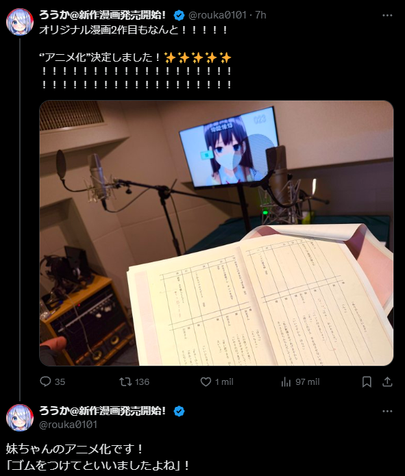 En su pequeño mensajito publicado en su cuenta de X dijo que su segunda ONA fue decidida. Además de esto, abajo confirmó que este episodio será dedicado Nanami, la hermana seria de la protagonista porque adaptaran el manguita hentai de Gomu o Tsukete a Iimashita yo ne…