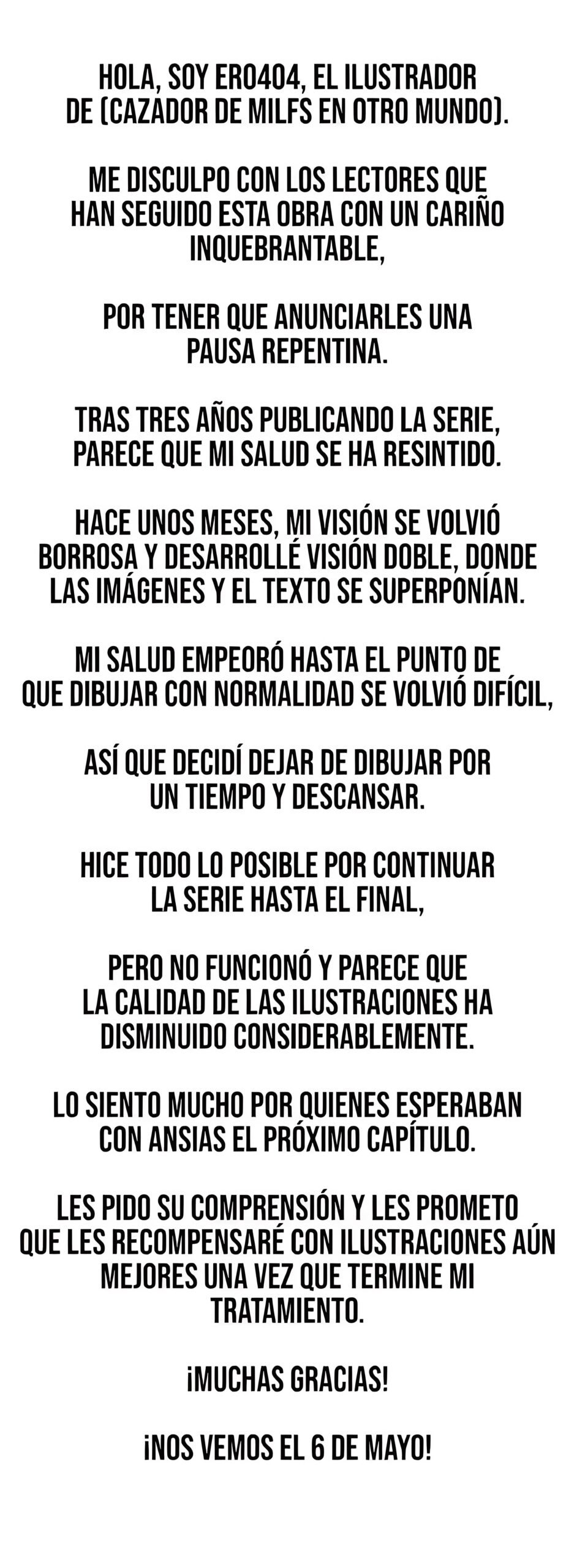 Hace varias horas en la pagina oficial de Toptoon se dio un anuncio sobre el hiatus del manhwa +18 «Cazador de milfs de otro mundo» por motivos de agotamiento de su artista.