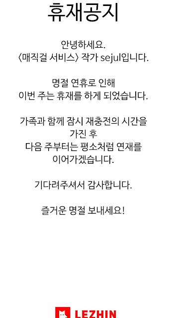 El 10 de octubre la pagina oficial de Lezhin público un comunicado sobre el autor SEJUL dando el aviso de que el manhwa para adultos «Trabajando con chicas Mágicas» o «Al servicio de las chicas mágicas» entrara en pausa debido a que el autor se tomará un descanso.