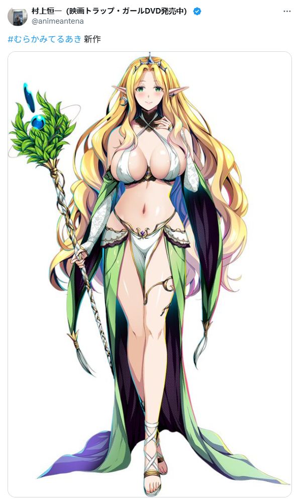 Esta importante noticia fue anunciada por Kouichi Murakami en su cuenta oficial de X. En su tuit dice: «El nuevo trabajo de Teruaki Murakami«, y adjunta una imagen de una elfa muy sabrosa. Después de una extenuante investigación, supimos que ese personaje es Clarice, la princesa de los elfos del juego Juurin Oukoku.