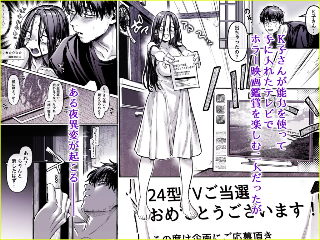 Para curar la depresión del protagonista, «K», su novia fantasma, usa sus poderes para ganar un concurso. Como premio, les regalan a la pareja una nueva televisión. Para su desgracia, o fortuna sexual, en esa TV hay un espectro que secuestra a «K» y viola al protagonista.