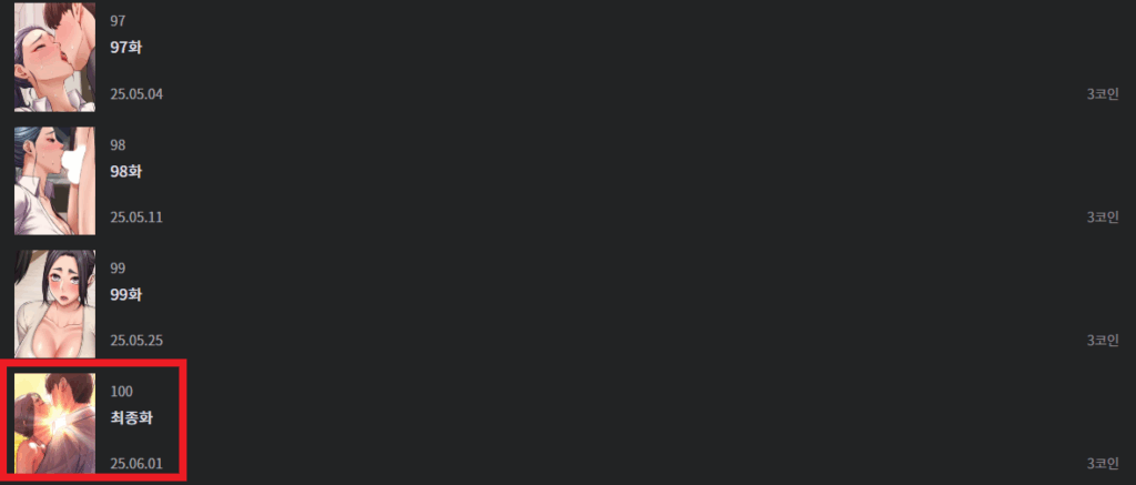 El pasado 1 de junio por medio de la página Lezhin, se público el capitulo 100 del Manhwa +18 «Bajo un mismo Techo con mi Ajumma» terminando así con la obra que llevaba en emisión desde febrero de 2022.