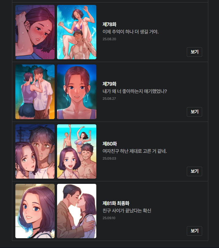 El pasado 10 de septiembre finalizó el manhwa para adultos «Seamos amigos desde hoy» o «Seamos amigos a partir de hoy» con un total de 109 capítulos (con relleno), mientras la de «sin relleno» finaliza con 81 capítulos en la pagina oficial de Toptoon.