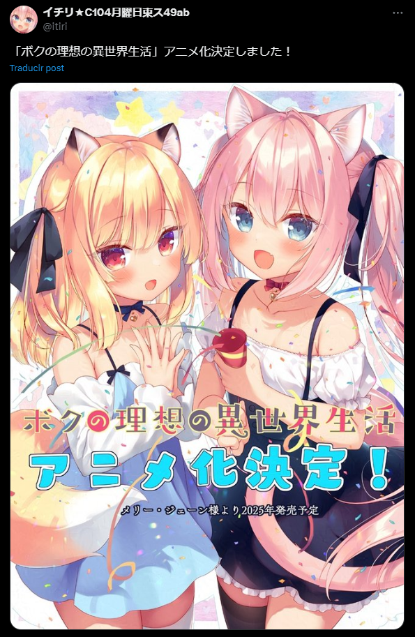 Buenas a todos, para comenzar el día les traigo una noticia que les va a gustar a los fans de las nekos y los pinches furros. Resulta que el doujinshi de Boku no Risou no isekai Seikatsu, va a ser animado.