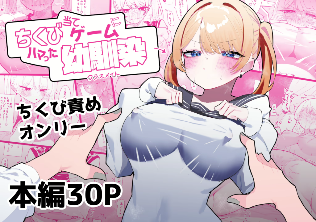 Chikubi Ate Game ni Hamatta Osananajimi (Childhood amigo Hooked en el Nipple Guessing Game) es una serie de dos doujinshis del autor Momico que comenzó a ser publicada el 4 de junio del 2023. Actualmente, la serie es exclusiva de DLsite.