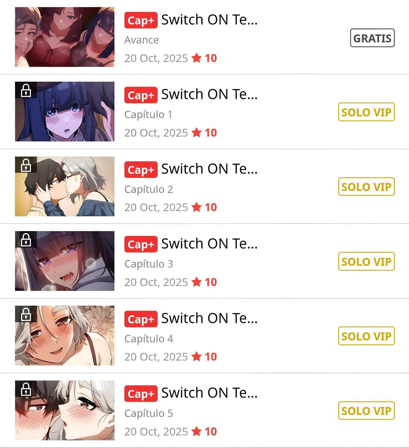 El pasado 20 de octubre la pagina oficial de Toomics en español, público la secuela del Manhwa +18 «Switch en» o «Encender» con 9 capítulos hasta el momento.