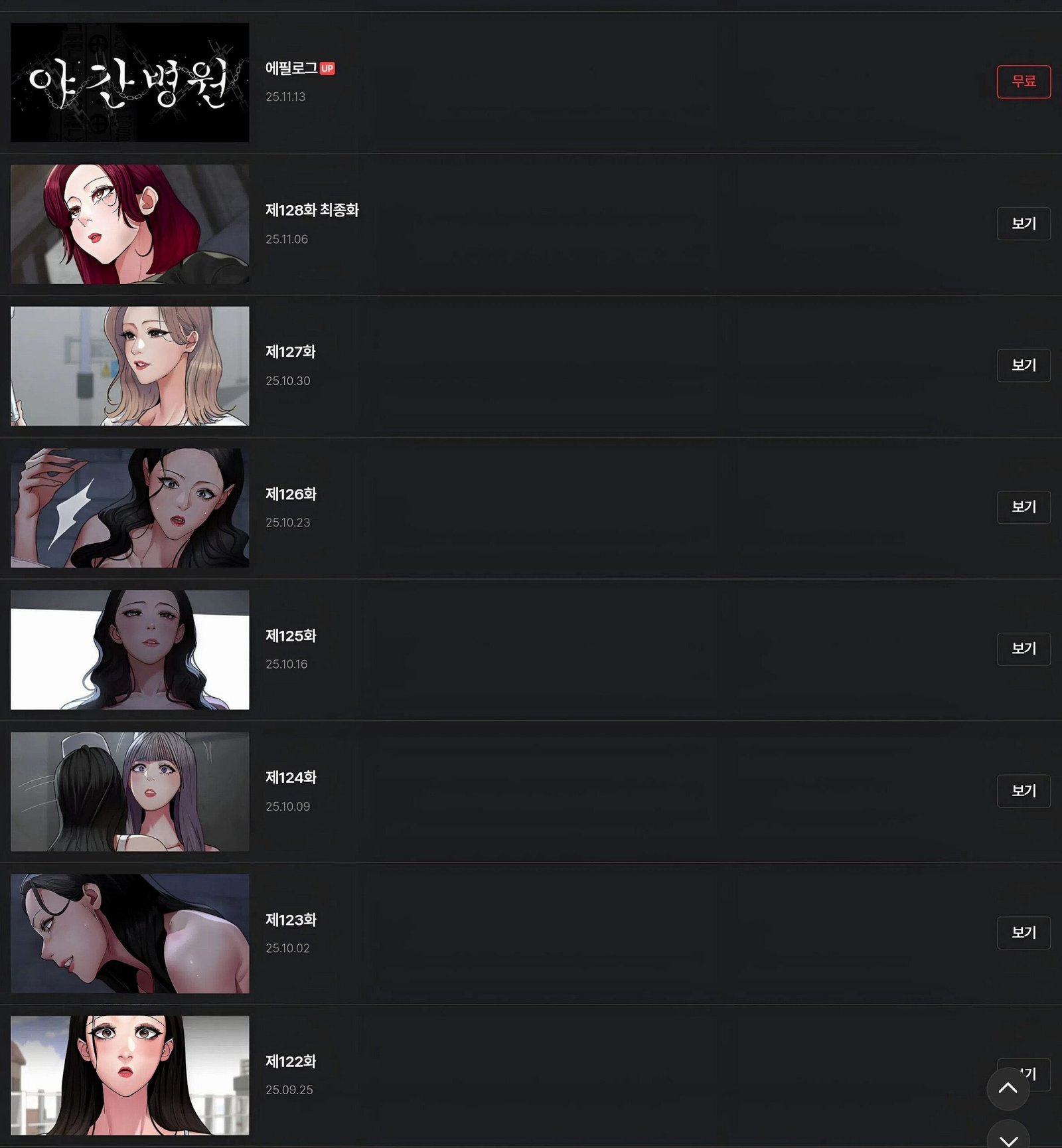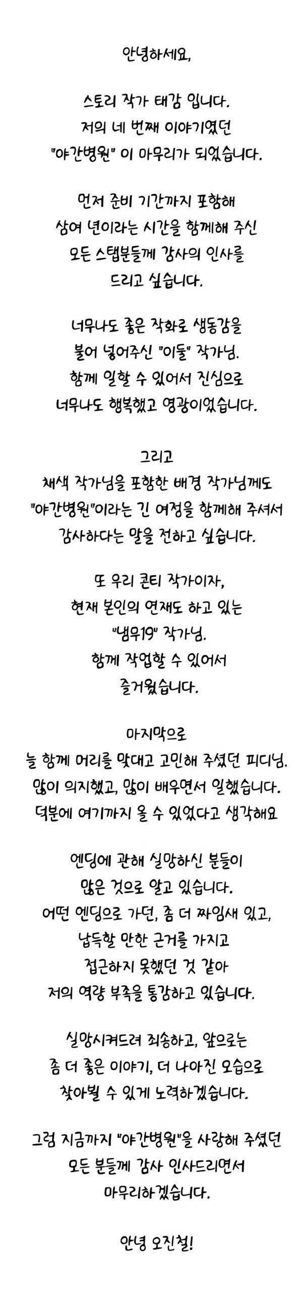 El pasado 6 de noviembre por medio de la página oficial de Toptoon se publico el ultimo capítulo del manhwa +18 «Hospital Nocturno» con un total de 128 capítulos. Pero también publicó su epílogo, agradeciendo por el apoyo a la obra.